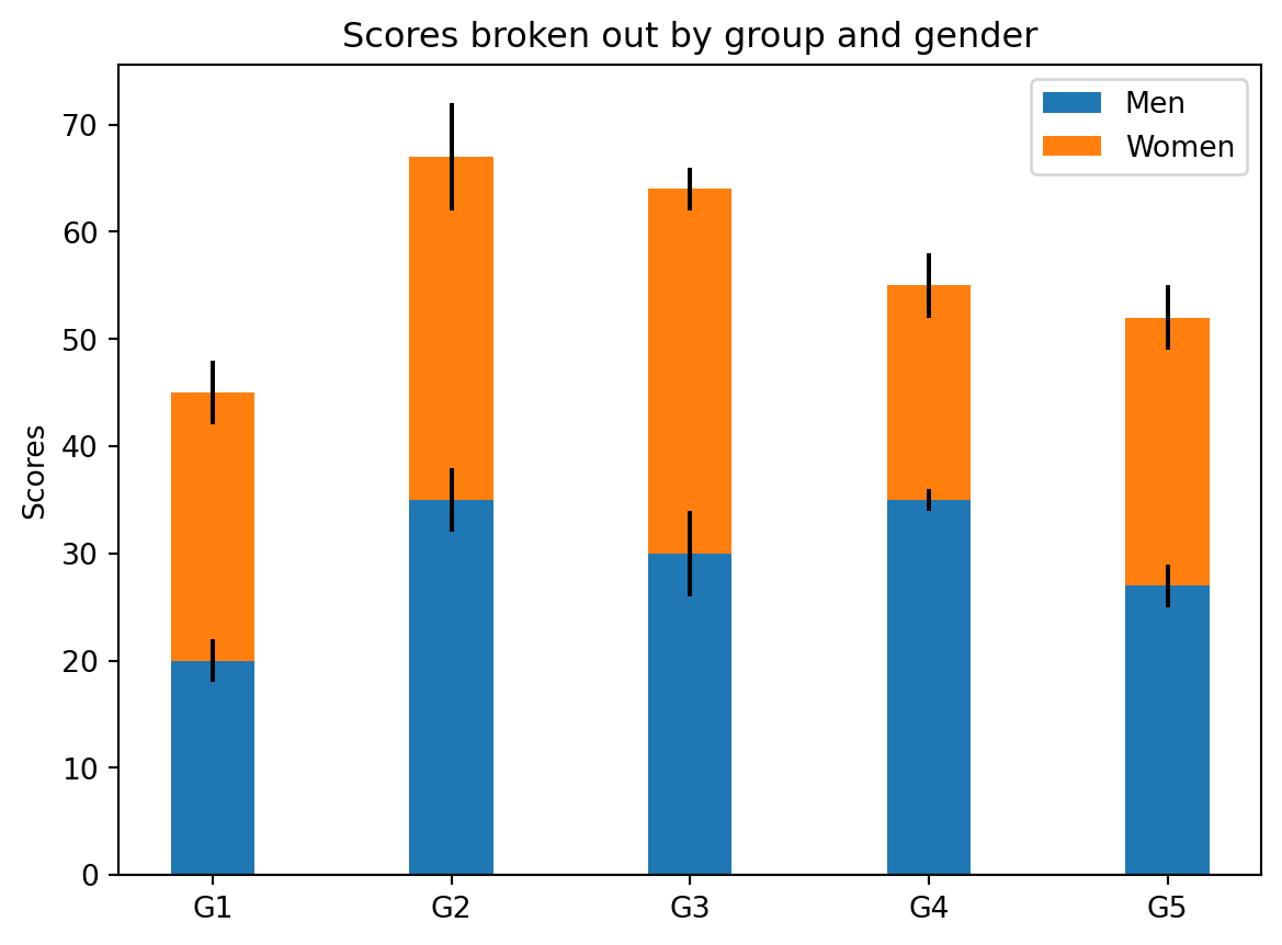 ax.bar(labels, women_means, width, yerr=women_std, bottom=men_means,